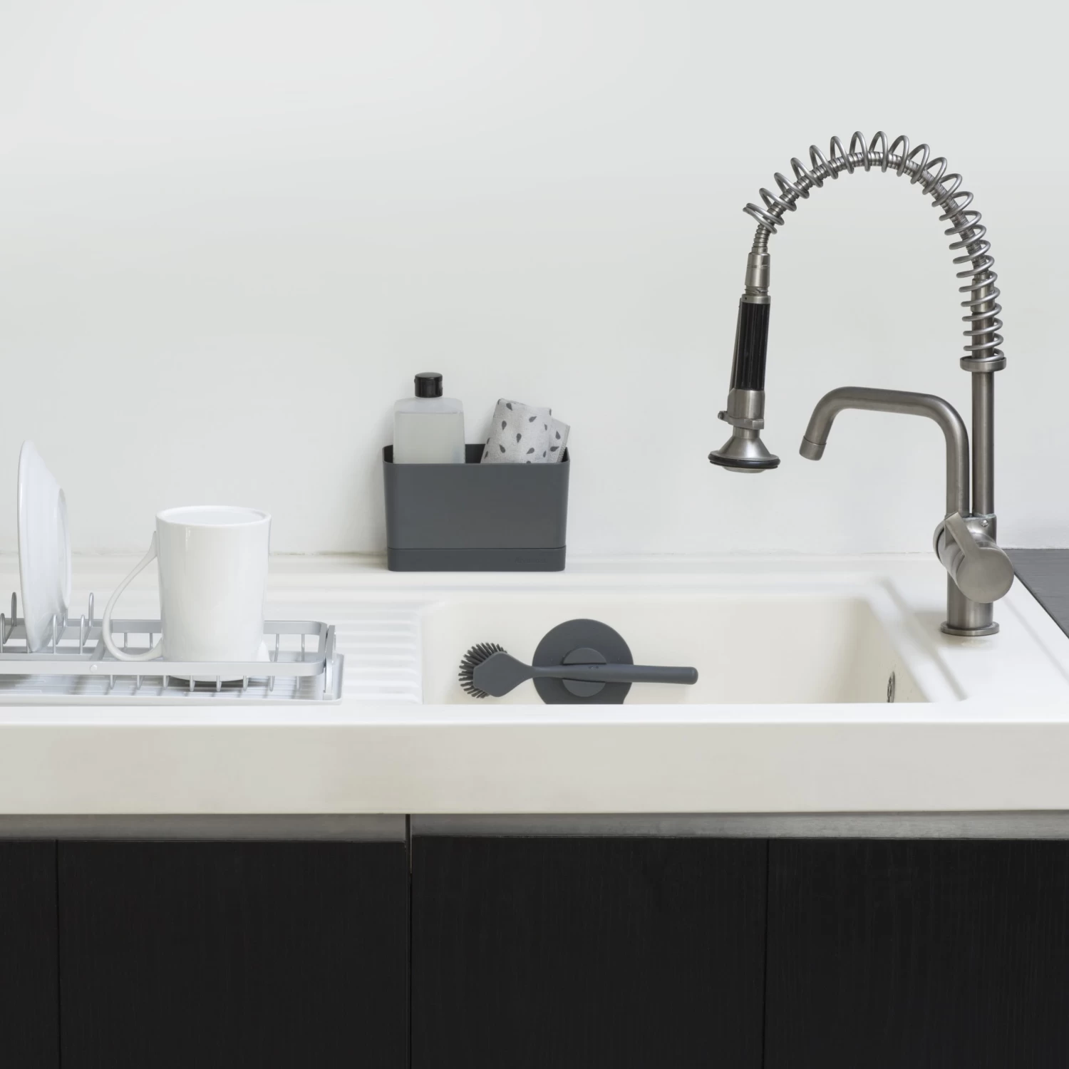 Mit dem Brabantia Geschirr-Organizer halten Sie Ihre Spüle immer sauber, trocken und organisiert! Trotz seines kompakten Designs bietet dieser Geschirr-Organizer viele verschiedene Abteilungen, um beispielsweise Spülmittel, Schwämme, Spültücher und anderes Spülzubehör aufzubewahren. Unter seinem Abtropfbereich befindet sich ein rutschfestes Tablett, das das abtropfende Wasser sicher auffängt und auch auf feuchten Oberflächen nicht verrutscht. Der Geschirr-Organizer ist leicht zu reinigen und spülmaschinenfest. Komplettieren Sie ihn mit anderem Zubehör von Brabantia und schaffen Sie eine einheitliche Atmosphäre in Ihrer Küche!