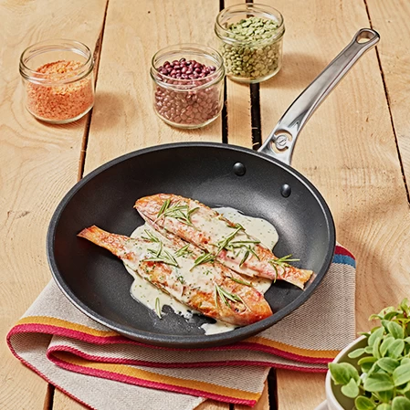 Die Choc Extreme Pfanne der französischen Marke de Buyer ist eine stilvolle Bratpfanne mit Antihaftbeschichtung und einem praktischen Griff der das Handhaben erleichtert. Die gleichmäßige Wärmeverteilung der Pfanne hält hohen Temperaturen stand und ist für schonendes Garen prädestiniert. Erhitzen Sie die Pfanne langsam, um die Antihaftbeschichtung nicht zu beschädigen und um ein perfektes Bratergebnis zu erzielen.