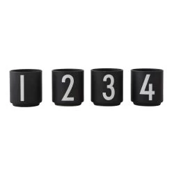 Die Design Letters Espressotassen 4er Pack schwarz erhalten Sie in einer stilvollen dunklen Farbe. Die kleinen Tassen eignen sich ausgezeichnet für einen dampfenden Espresso und sind aus feinem Bone China Porzellan gefertigt, das mit Ziffern in Arne Jacobsens Typografie von 1937 versehen ist. Die Tassen lassen sich zudem wunderbar mit Kerzenhaltern der Marke Design Letters für einen dekorativen Leuchter kombinieren.