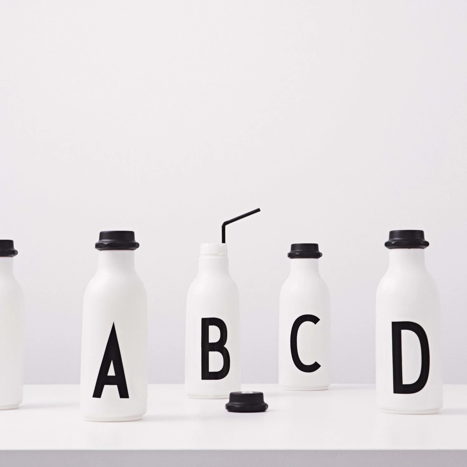 Diese BPA-freie Trinkflasche von Design Letters zeigt einen wahlfreien Buchstaben in der Design Letters typischen Arne Jacobsen Vintage Schriftart. Mit der Inspiration einer alten Milchflasche ist diese Flasche tropfdicht und damit für die Handtasche geeignet.