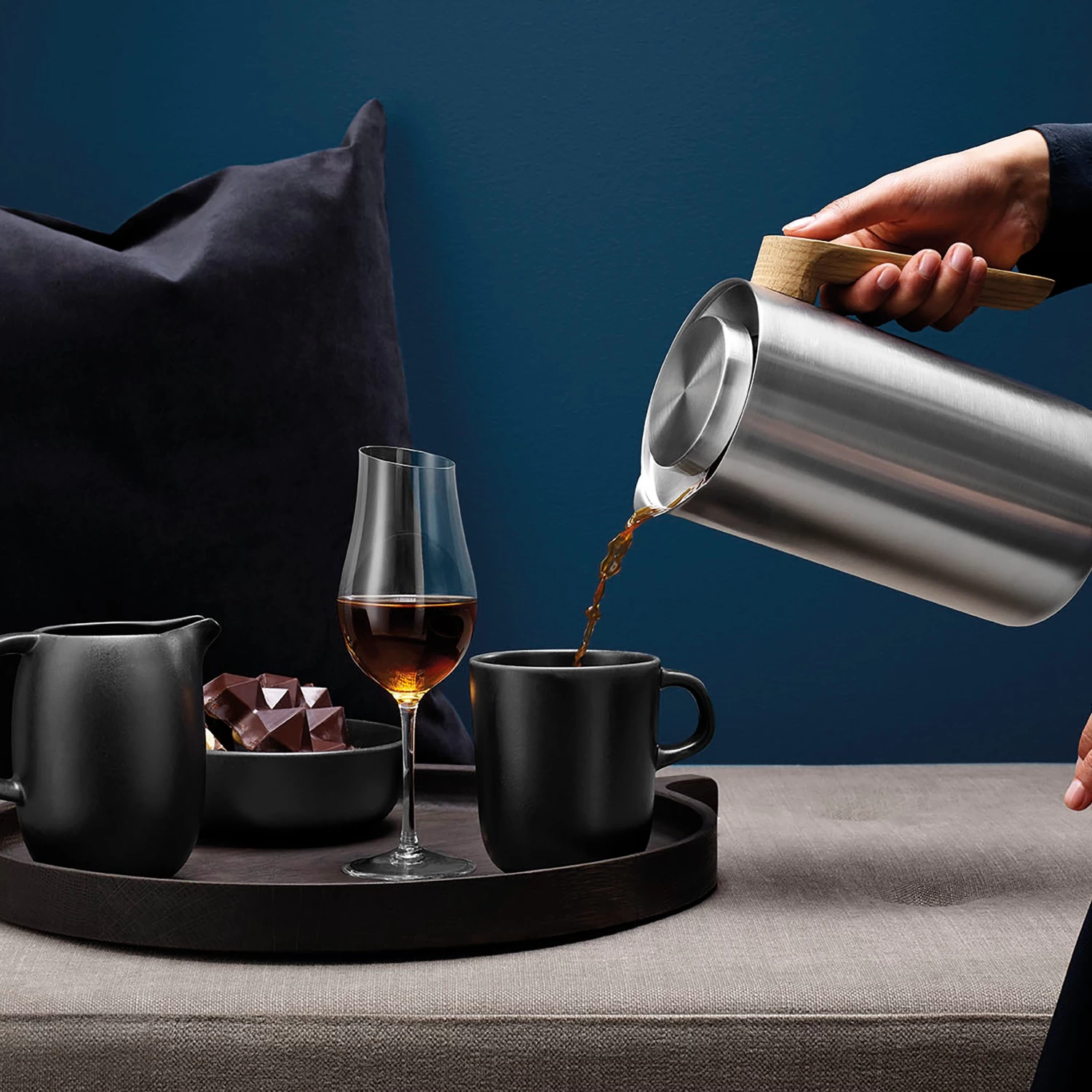 Die Nordic Kitchen Isolierkanne RS der klassischen Marke Eva Solo ist eine zeitlose Thermoskanne in neuartiger Ausführung mit hübschem Design und vielen gut durchdachten Details. Damit Getränke lange warm bleiben, ist die Kanne aus Edelstahl gefertigt und verfügt über eine doppelwandige Vakuumkonstruktion. Dies trägt auch zur Langlebigkeit der Kanne bei. Durch den Edelstahl ist der Ausguss tropffrei und der aus Eiche gefertigte Handgriff liegt angenehm in den Händen. Die stilvolle und schnörkellose nordische Formsprache erscheint als i-Tüpfelchen, wobei praktische Funktionen mit schönem Design vereint werden.