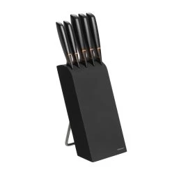 Das Set enthält ein Schälmesser, ein gezahntes Tomatenmesser, ein Brotmesser, ein großes französisches Küchenmesser sowie ein Santoku Messer aus hochwertigem japanischem Stahl. Die Messer haben ein stilvolles schwarzes Design und sind mit ihren ergonomischen Griffen und scharfen Klingen eine Freude für jeden Hobbykoch. Der Messerblock kann an der Wand montiert oder direkt auf der Küchentheke platziert werden.