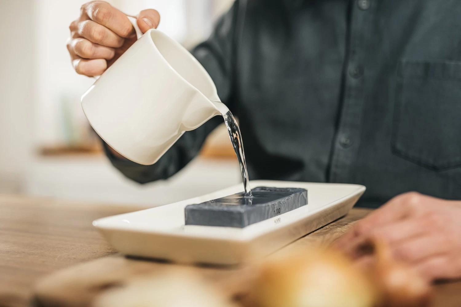 1 Schleifstein mit zwei Körnungen (1000 bzw. 5000): Höhe: 2,5 cm, Breite 5,9 cm, Länge 14,9 cm