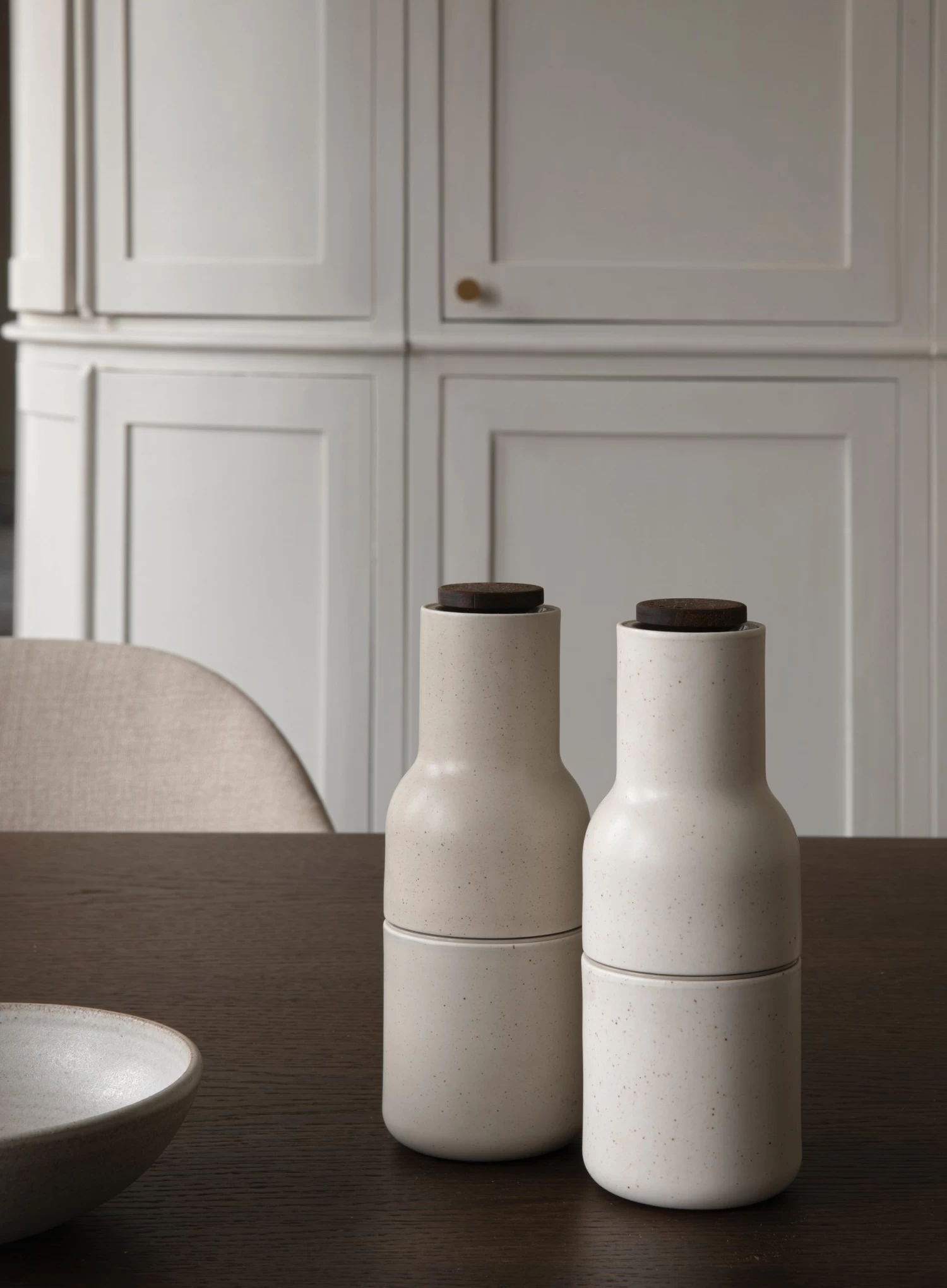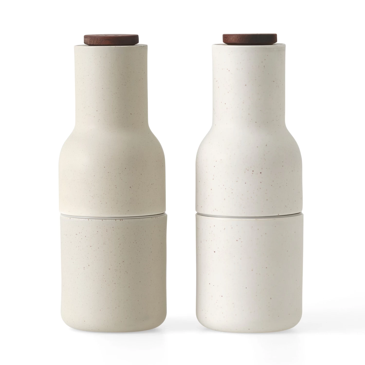 Die Bottle Grinder Gewürzmühlen 2er-Pack von der dänischen Marke Menu sind zwei flaschenförmige Gewürzmühlen aus Keramik. Hinter dem Design steht Norm Architects, die den Mühlen eine bedienerfreundliche und spielerische Form gaben. Das Keramik-Mahlwerk ist äußerst leistungsstark und effizient und eignet sich für die meisten Arten von Gewürzen, sogar für Samen und Trockenfrüchte. Das Mahlwerk lässt sich durch Öffnen und Schließen in der Mitte leicht nachfüllen, was auch für die Reinigung praktisch ist, falls Sie auf ein neues Gewürz umsteigen möchten. Um die Stärke der Mahlung einzustellen, drehen Sie einfach am oberen Drehknopf. Das innovative Design, bei dem sich das Mahlwerk oben befindet, verhindert eventuelles Verschütten, wenn die Gewürzmühle nicht in Gebrauch ist. Die stromlinienförmigen Gewürzmühlen sind effiziente Helfer, die den Geschmack direkt verbessern!