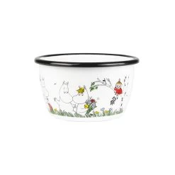 Diese handgefertigte Emailleschale von Muurla mit dem Motiv „Happy Family“ zeigt die Mumin-Familie, die kleine My und Snorkfräulein beim Blumenpflücken auf einer Wiese. Die Schale hat ein Fassungsvermögen von 300 ml und eine doppelte Emaillebeschichtung, weshalb Sie sich perfekt für Ihr morgendliches Frühstück eignet.