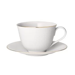 Die Swedish Grace Gala Teetasse mit dazugehöriger Untertasse, ist Teil der beliebten Swedish Grace Gala Serie, der Jubiläumsausgabe von Rörstrand, die mit echtem Golddekor verziert ist. Diese exklusive Serie wurde speziell entwickelt, um das 90-jährige Jubiläum von Louise Adelborg im Jahr 2020 zu feiern, die das legendäre schwedische Grace-Geschirr entworfen hat. Das Geschirr hieß ursprünglich National Tableware, wurde aber später 2001 in Swedish Grace umbenannt, um das goldene Zeitalter des nordischen Klassizismus zwischen 1910 und 1930 zu würdigen. Das schöne Set mit Teetasse und Untertasse wird in einer luxuriösen Geschenkverpackung geliefert.