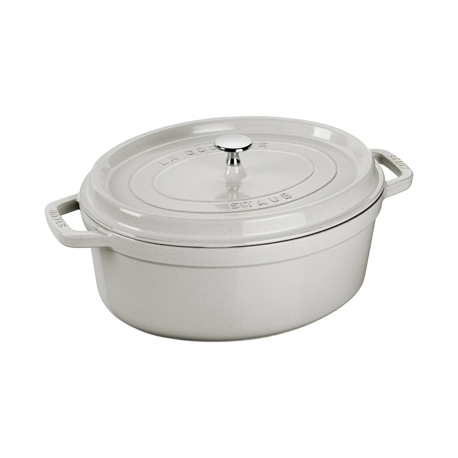 Der edle Staub White Truffle Topf oval hat eine emaillierte Innenseite und einen innovativen Deckel der das gleichmäßige Zubereiten von Speisen ermöglicht. Der stilvolle Topf ist Teil der beliebten White Truffle Serie, welche von der berühmten Luxus Delikatesse inspiriert wurde.