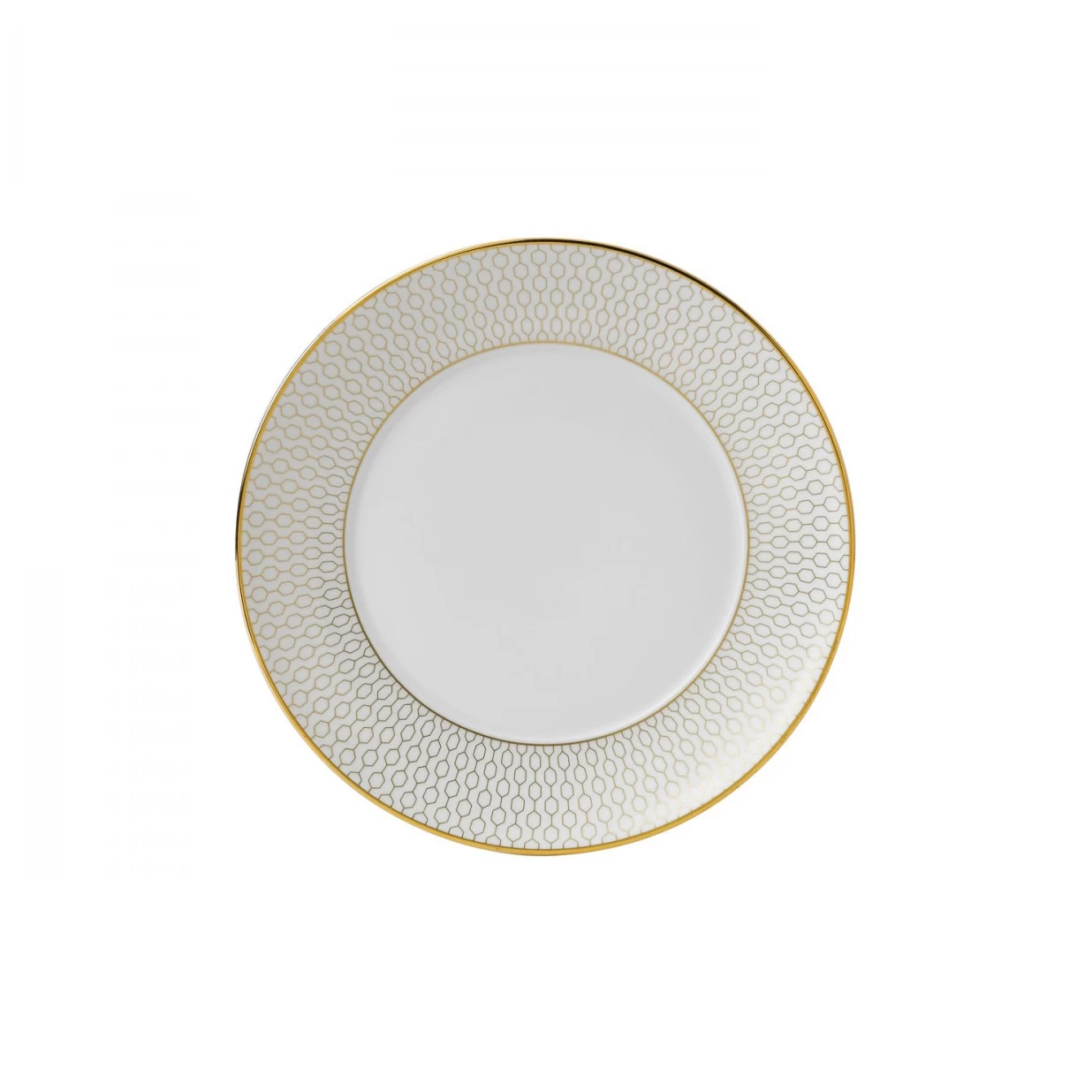 Der Arris Teller der englischen Firma Wedgwood zeichnet sich durch sein luxuriöses Erscheinungsbild aus, welches aufgrund des goldenen, mit einem geometrischen Muster versehenen Rands zustande kommt. Er ist Teil der Arris-Serie, welche sich durch eine Vielfalt an Produkten auszeichnet und beispielsweise auch tiefe Teller und Servierteller beinhaltet. Dieses Porzellan lässt sich wunderbar mit anderen Teilen der Kollektion oder als einzelnes elegantes Detail auf dem Tisch arrangieren, eignet sich aber auch hervorragend für Ihre Porzellan-Sammlung. Zudem ist es perfekt als Geschenk für frisch Vermählte geeignet.
